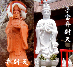 七福神さまの中には6人の男神さまと1人の女神さまがおられます。1人の女神さまは弁財天さまと言われ頭上に白蛇さまを使者としてのせられ、人々のお願い事を叶えて下さると言われております。人間社会においても、女性を大切にし、女性がいなければ子孫は繁栄していかないということを示されております。